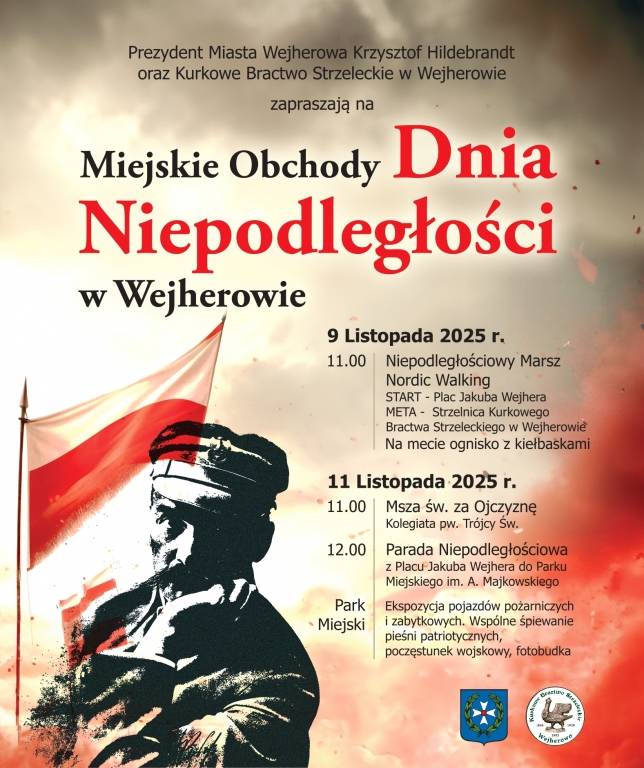11 listopada - główne obchody Święta Niepodległości w Wejherowie. Rozpocznie je o godz. 11.00 msza św. w Kolegiacie pw. Św. Trójcy w intencji Ojczyzny. O godz. 12.00 Parada Niepodległościowa wyruszy z Placu Jakuba Wejhera do Parku Miejskiego, gdzie wspólnie zaśpiewamy Hymn Polski oraz pieśni patriotyczne. Tego dnia będzie można obejrzeć pojazdy pożarnicze i zabytkowe, będzie także wojskowy poczęstunek i fotobudka.  W programie uroczystości przewidziano także występ zespołu PółSerio.
