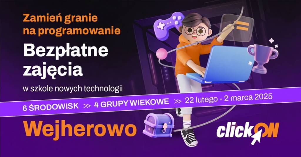Głównym celem akcji clickON jest wprowadzenie młodych ludzi w fascynujący i dynamicznie rozwijający się świat nowych technologii. Program zajęć został stworzony z myślą o dzieciach i młodzieży, którzy pragną poznać tajniki programowania w sposób zabawny, angażujący i przystępny. Podczas 1,5-godzinnych warsztatów, prowadzonych przez doświadczonych trenerów programowania, uczestnicy będą mieli okazję stworzyć swoje pierwsze projekty oraz zgłębić wiedzę o tym, jak technologie kształtują otaczającą nas rzeczywistość.
