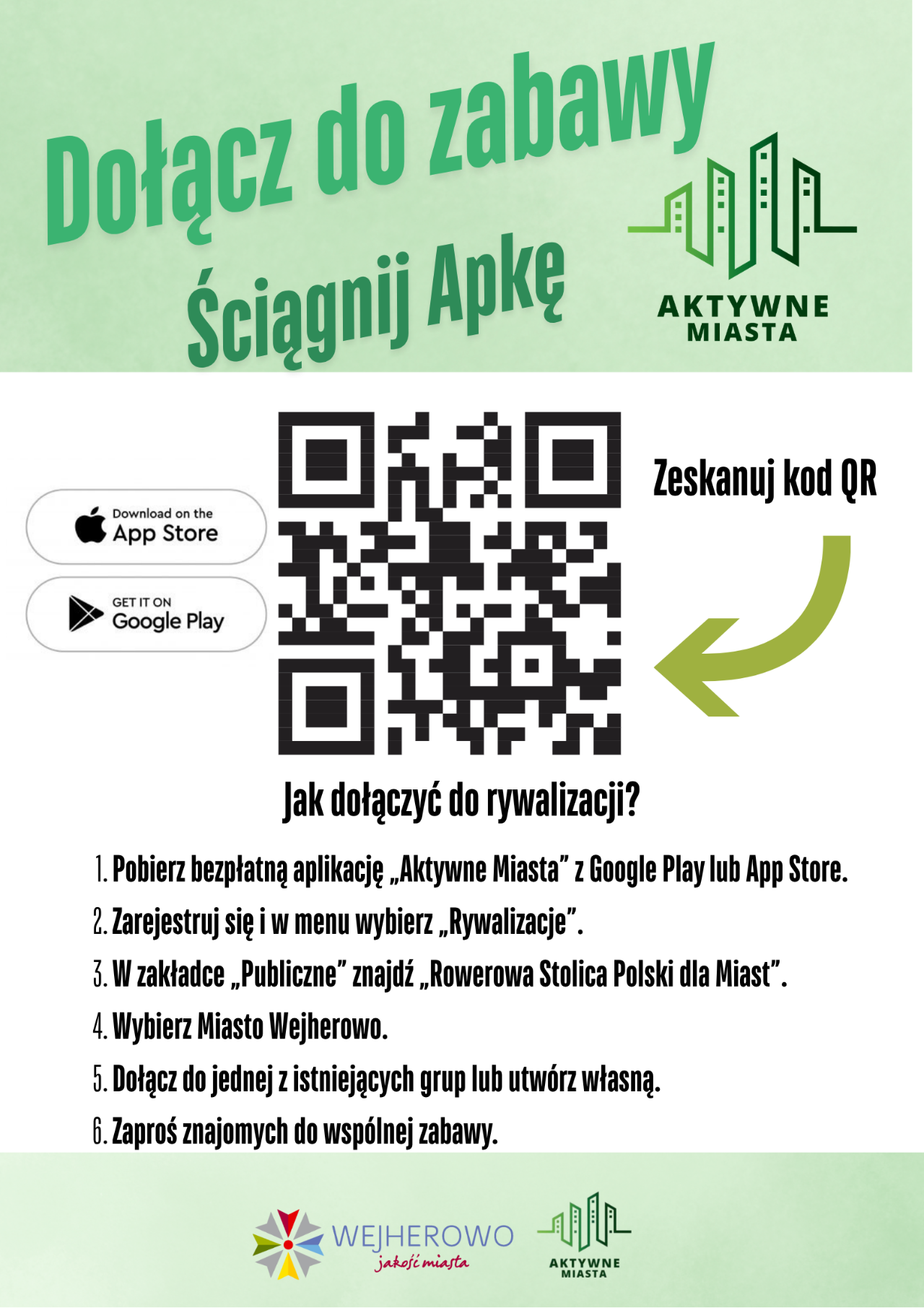 Aby dołączyć do akcji wystarczy pobrać darmową aplikację Aktywne Miasta, zarejestrować się i kręcić kilometry dla Wejherowa